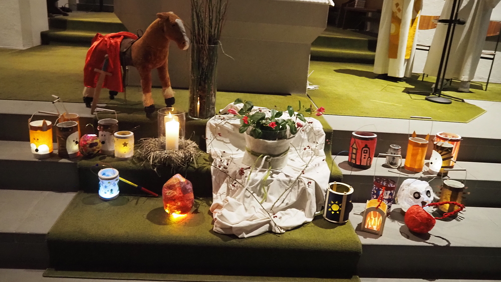 Beim diesjährigen Martinsfest am 8. November durften die Kinder mit ihren leuchtenden Laternen in die dunkle Kirche einziehen. Musikalisch begleitet von der Röthner Jungmusik feierten Vikar Willi und Gemeindeleiter Michael das Martinsfest.